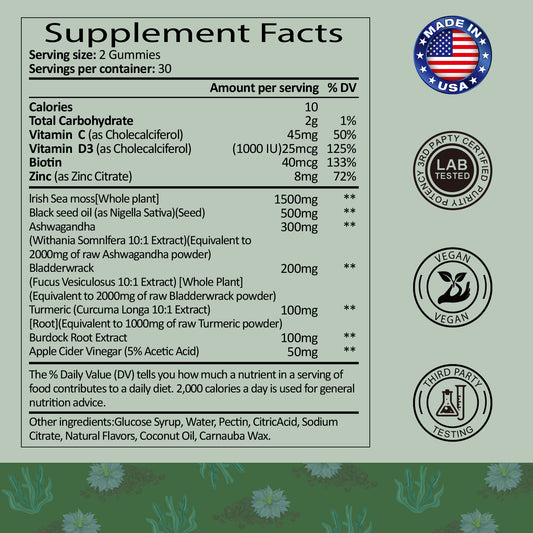 Sea Moss Black Seed Oil Gummies Extracts from Irish Seamoss Whole Plant Advanced with Black Seed Oil, Ashwagandha Burdock Root Turmeric Bladderwrack - Support Immune, Joints, Digestion, Hair & Skin