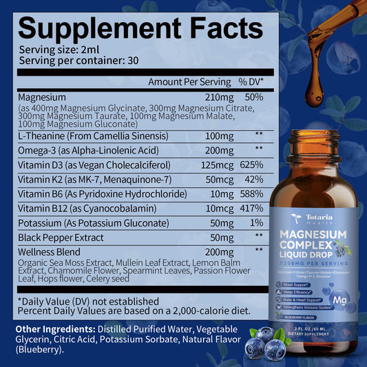 21 in 1 Magnesium Glycinate Complex Liquid Drop with Vitamin D3,K2,B6 & B12 Plus L-Theanine Omega-3 Sea Moss Extract for Energy,Sleep,Joint,Heart Health Sugar Free Blueberry Flavor,2 Fl Oz