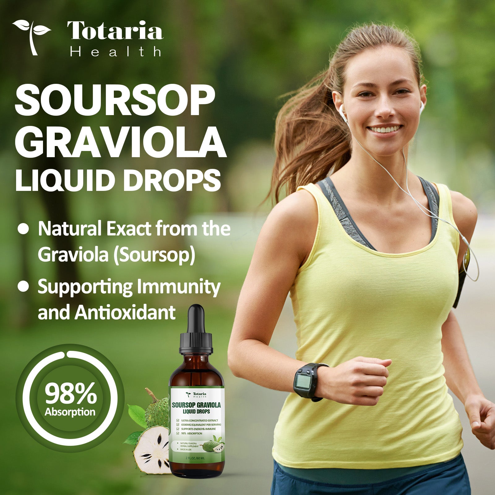 - Multiple Benefits: Totaria powerful soursop liquid drops are rich in sour sop Graviola Leaves. using soursop leaf 5:1 extraction. equivalent to 6000mg of Soursop Leaf; Using soursop fruit 10:1 Extract. Equivalent to 500mg of Soursop Fruit. which are antioxidant and support energy. immunity. metabolism. digestive health and help you Zzz better. Just 2 ml a day. Better Life. Better You!