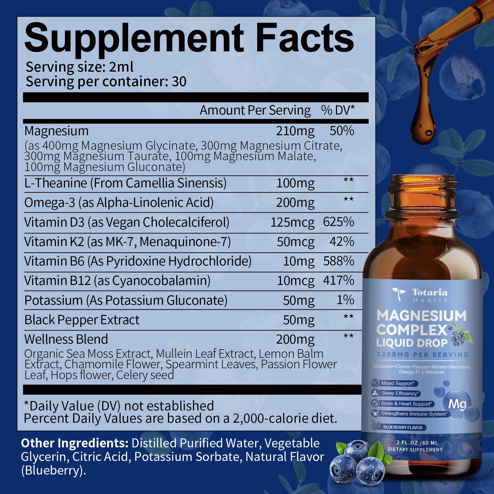 21 in 1 Magnesium Glycinate Complex Liquid Drop with Vitamin D3,K2,B6 & B12 Plus L-Theanine Omega-3 Sea Moss Extract for Energy,Sleep,Joint,Heart Health Sugar Free Blueberry Flavor,2 Fl Oz