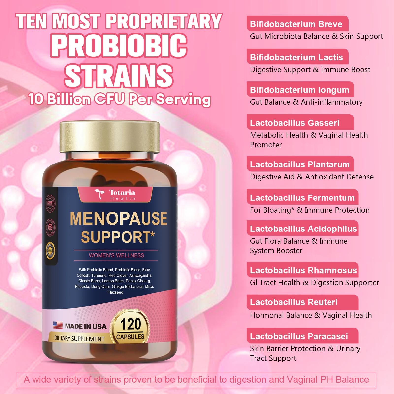 - Probiotic Support for Women's Health: Our women's probiotic is carefully formulated to support optimal hormone balance and overall well-being during menopause. Containing Bifidobacterium Lactis. Acidophilus Probiotic. this supplement promotes a healthy gut microbiome. which is crucial for digestive health and the absorption of nutrients. Each capsule is designed to support your body's natural processes and maintain overall health.