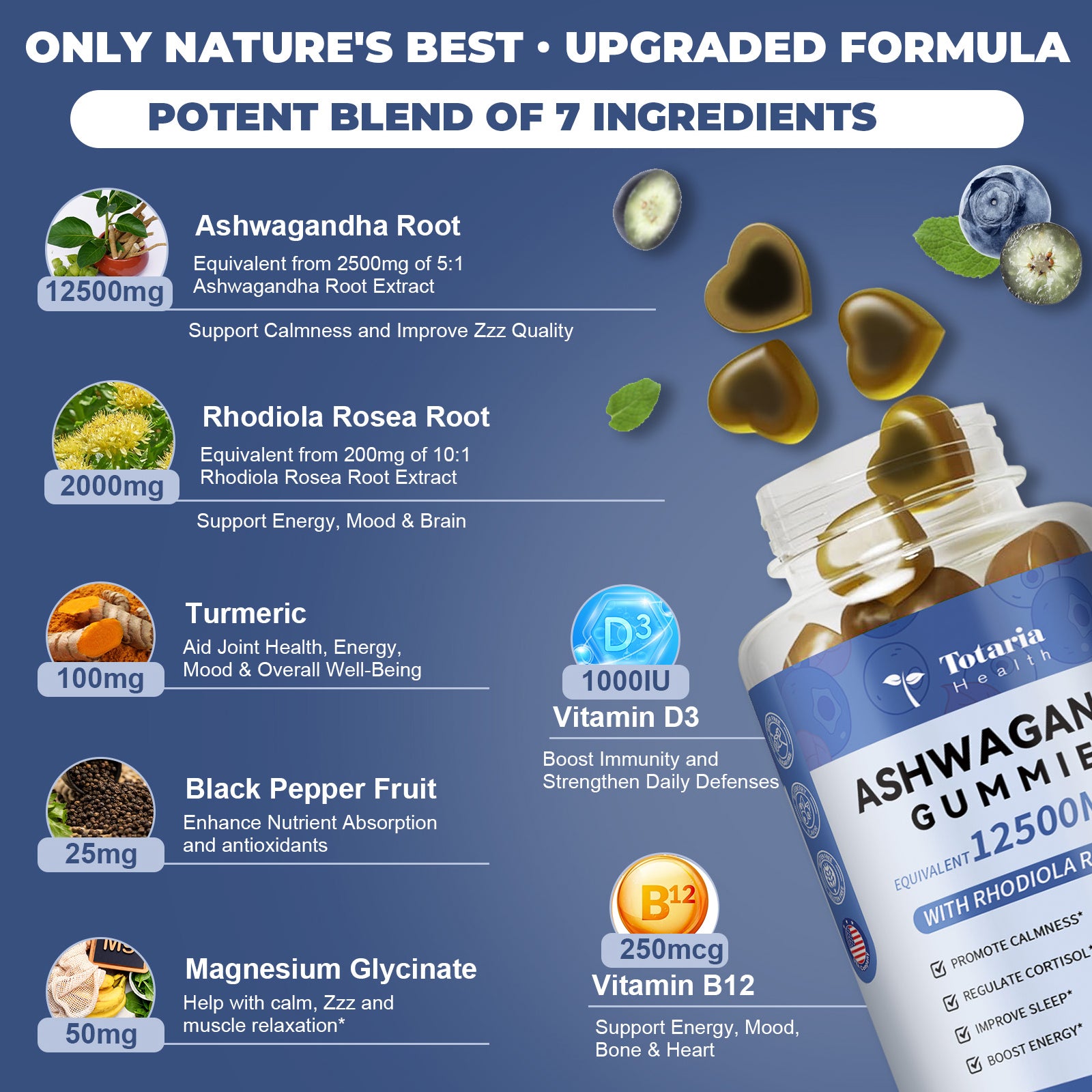 - Maximum Efficacy: Containing 12500mg premium ashwagandha root powder. Our premium formula of ashwagandha stress* gummies delivers a remarkable 2500mg of pure ashwagandha root extract (5:1 Extract) per serving. combined with turmeric. magnesium glycinate. vitamin B12. and vitamin D3. Enhanced with black pepper for optimal nutrient absorption.