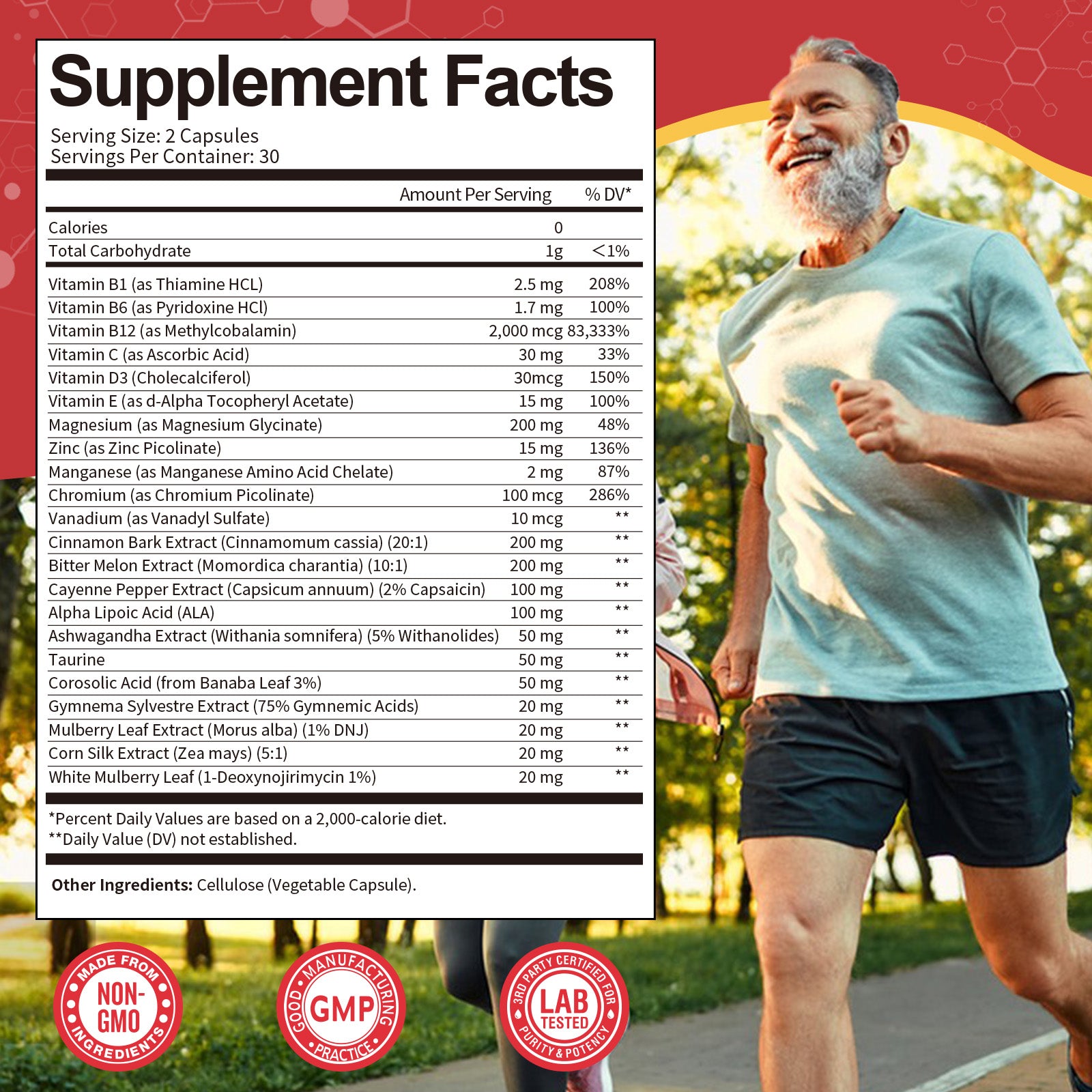 - Powerful Ingredients: Vitamin B1. B6. B12. C. D3. E. Magnesium. Zinc. Manganese. Chromium. Vanadium. Cinnamon Bark Extract. Bitter Melon Extract. Cayenne Pepper Extract. Alpha Lipoic Acid. Ashwagandha Extract. Taurine. Corosolic Acid. Gymnema Sylvestre Extract. Mulberry Leaf Extract. Corn Silk Extract.