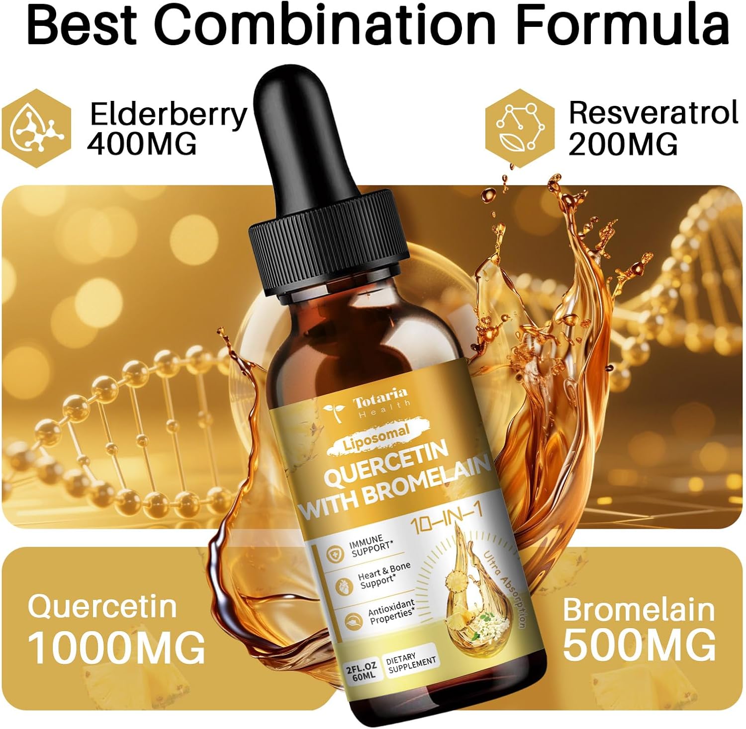 Liposomal Quercetin with Bromelain Liquid Drops - High Absorption Quercetin 1000mg & Bromelain 500mg Plus Elderberry,Vitamin C,Zinc for Immune & Antioxidant & Heart & Bone Support- 2 Fl Oz