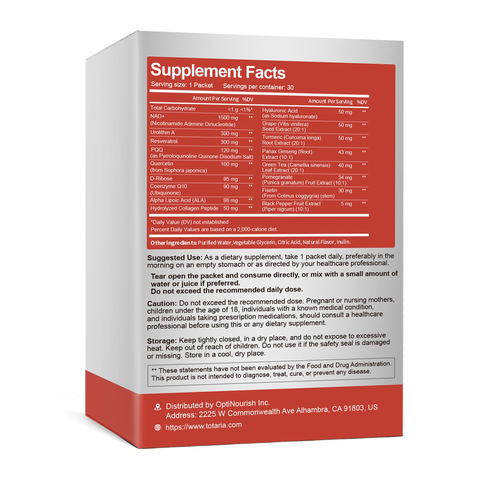 - 【16-in-1 Advanced NAD+ Formula】Totaria's premium NAD liquid supplement combines 1500mg of extra-strength NAD+ with 15 science-backed ingredients. including Resveratrol. Urolithin A. PQQ. CoQ10. Alpha Lipoic Acid. and Hydrolyzed Collagen. This synergistic blend works together to support cellular energy production. targeting the root of healthy aging and vitality.