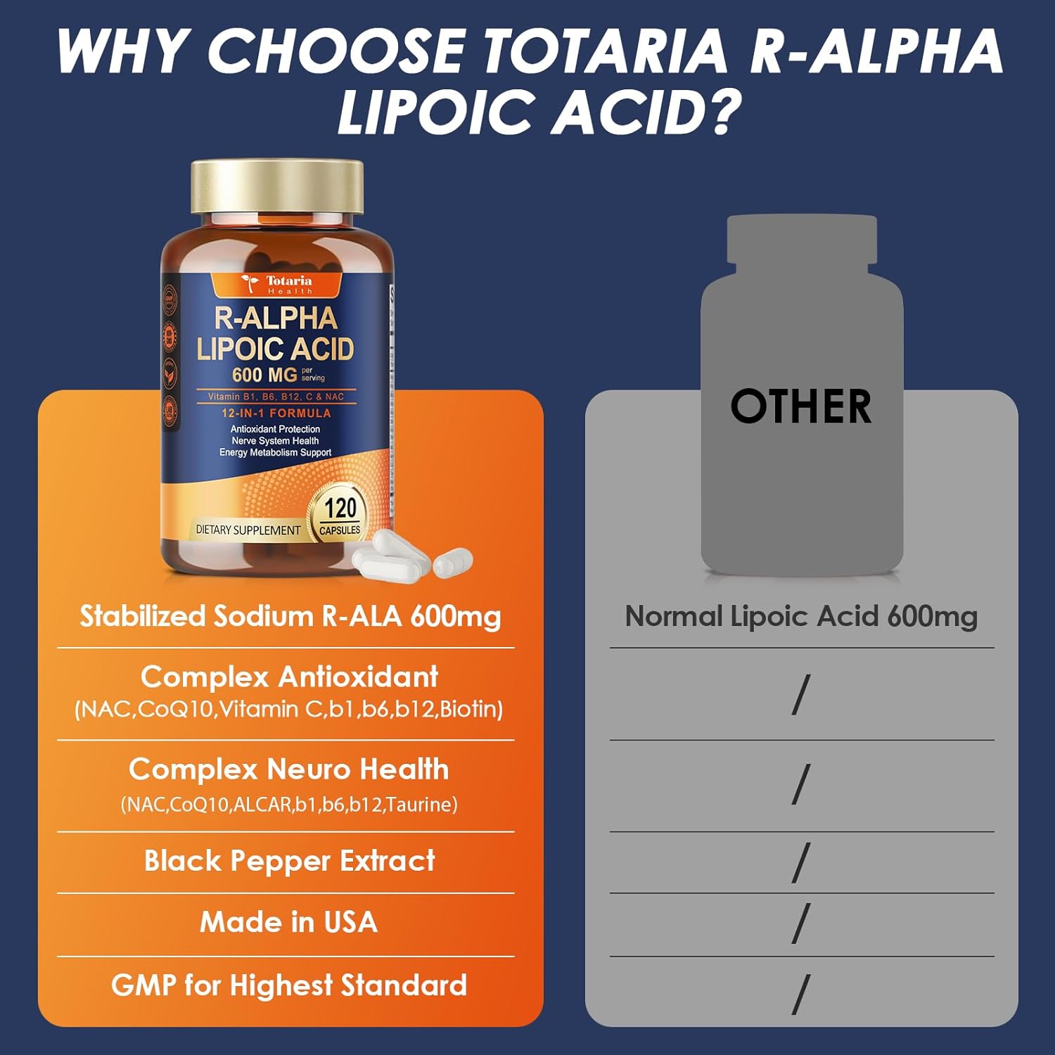 - Comprehensive Cellular & Neuro Protection: Totaria R-Lipoic Acid Capsules are expertly formulated with a synergistic blend of high-potency ingredients—Sodium R-Lipoic Acid. NAC. Acetyl-L-Carnitine. CoQ10. Taurine. Black Pepper Extract. and essential vitamins including B1. B6. B12. Biotin. and Vitamin C—to help defend against oxidative stress and support optimal nervous system health and emotional balance.
