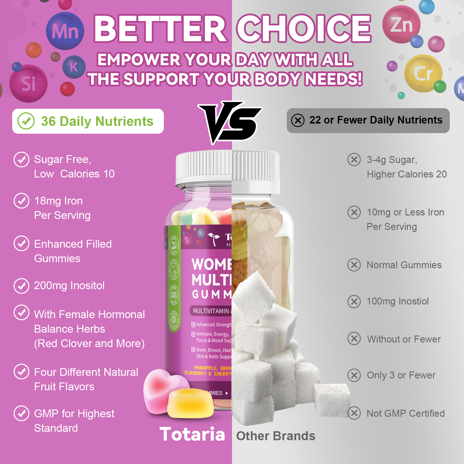 - Essential Minerals for Overall Health: Key minerals such as Calcium. Iron. Magnesium. Zinc. Chromium. Molybdenum. and Potassium are included. These minerals contribute to bone health and immune support. Suitable for Women. ages 14+. Whether you are a 40+. 50+ women. you can feel confident with your health from Totaria multivitamin gummies.