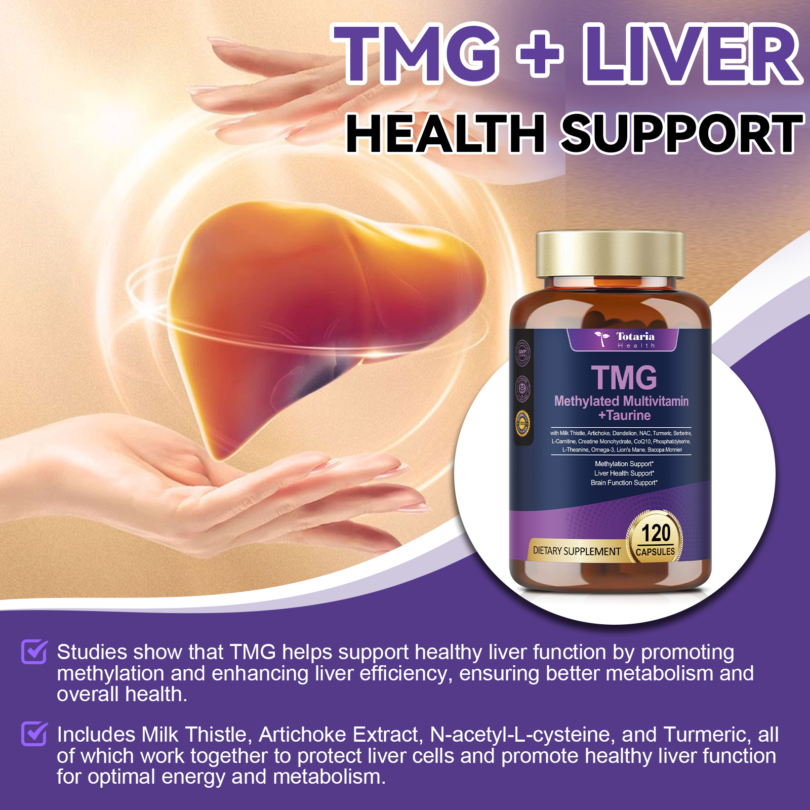 Totaria 750mg TMG Supplements (Trimethylglycine), Methylated Multivitamin for Women Men w/ B6, B12, B9, NAC, L-Taurine, Choline, for Methylation, Liver, Homocysteine Levels, Brain, 120 Vegan Capsules