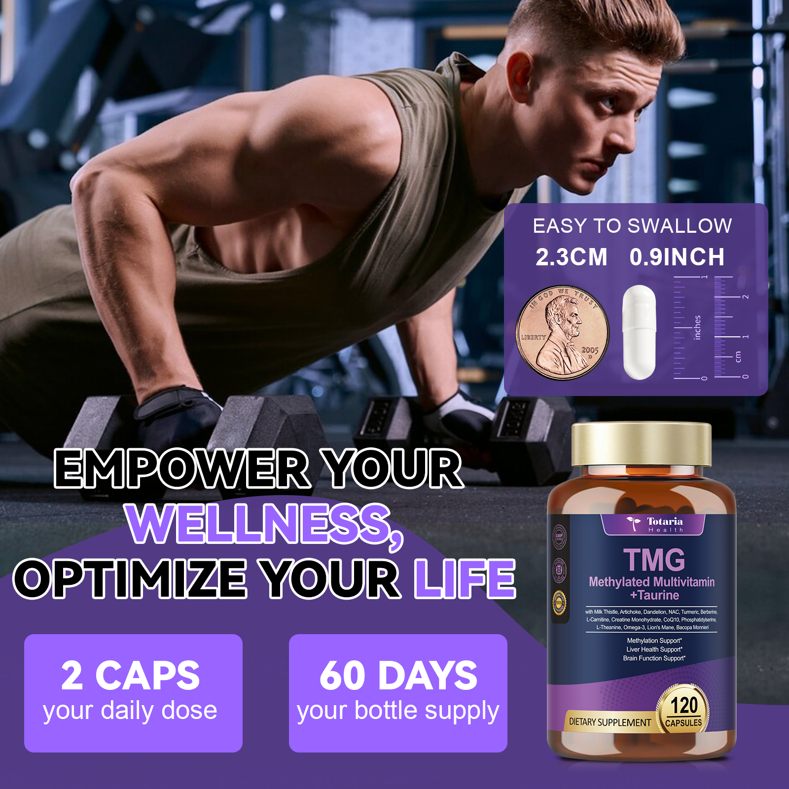 - Methylated Multivitamin + TMG Supplement: This advanced methylated formula features active forms of B12 (methylcobalamin) and folate (5-MTHF). alongside key amino acids like Taurine and TMG. to support efficient methylation. It supports cellular health. energy and metabolism. and overall wellness.