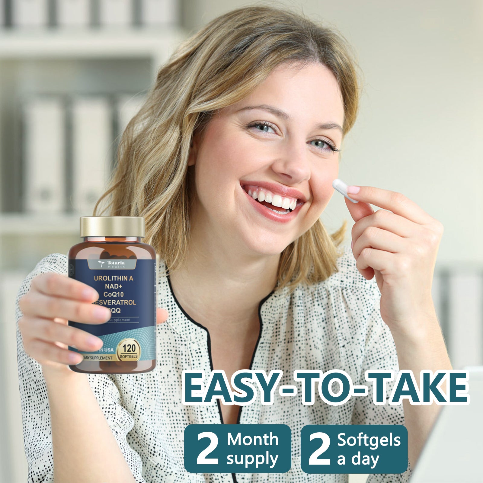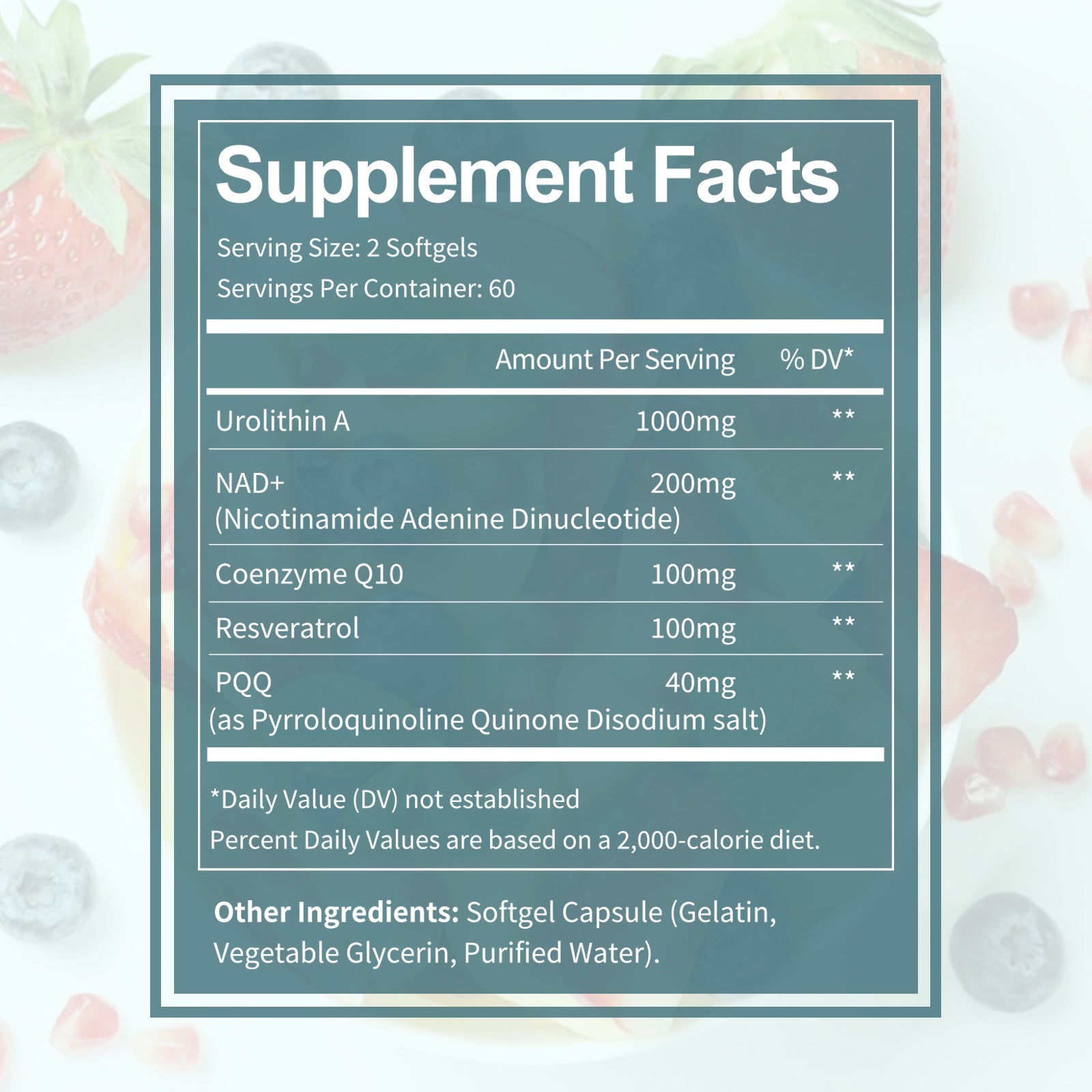 - Premium Formulation: Experience the power of our Urolithin supplement. meticulously crafted with a synergistic blend of NAD+. Coenzyme Q10. Resveratrol. and PQQ. These key ingredients work in harmony to support cellular health and vitality.