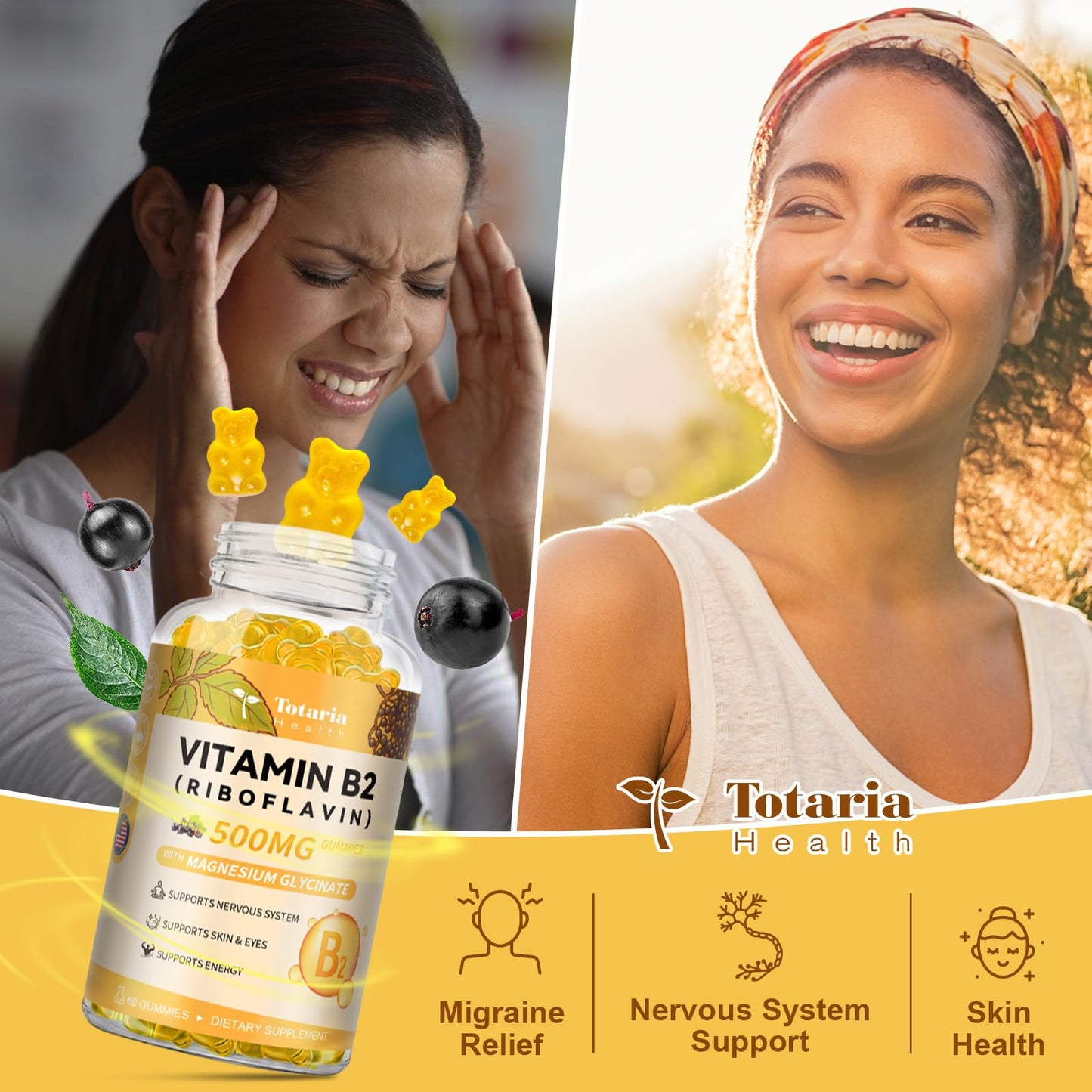 - Powerful & Enhanced Formula: Vitamin B2( Riboflavin). is one of eight B vitamins. and is necessary for the highly effective energy booster. Totaria Vitamin B2 gummies contain Riboflavin. magnesium glycinate. and elderberry. These ingredients work together to provide comprehensive support for energy. nervous system health. and antioxidant function. helping you feel your best throughout the day.