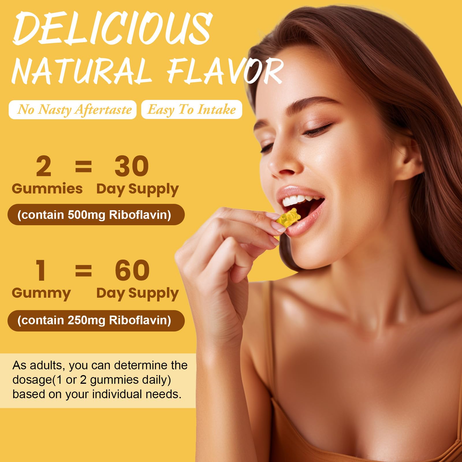 - Convenient and Easy to Chew: These gummies are delicious. easy to chew. and do not stick together. making them ideal for adults with difficulty taking capsules. They make your daily health routine a tasty treat. (Note: 1 Gummy contains 250mg riboflavin. 2 Gummies contain 500mg riboflavin. You can determine the dosage(1 or 2 gummies daily) based on your individual needs.)